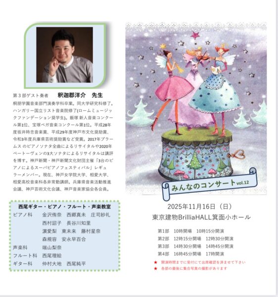 西尾ピアノ教室の発表会は11月16日(日)10:30より箕面市立文化芸能劇場にて開催されます。