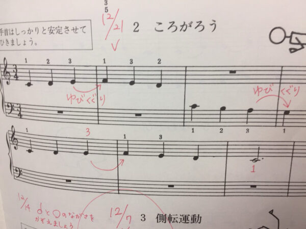 楽譜には「側転運動」と丸で囲んであります。