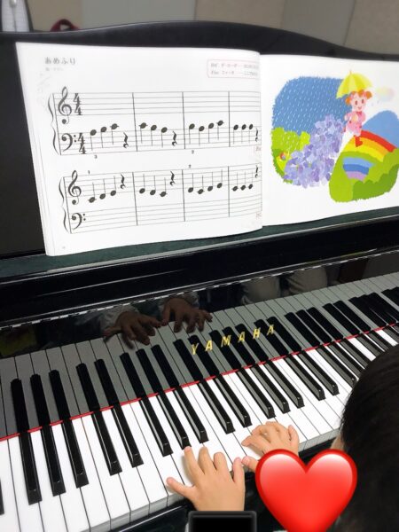 今日の曲は『あめふり』。楽譜には可愛いイラストも添えられていて、視覚的にもイメージを膨らませていきます。
