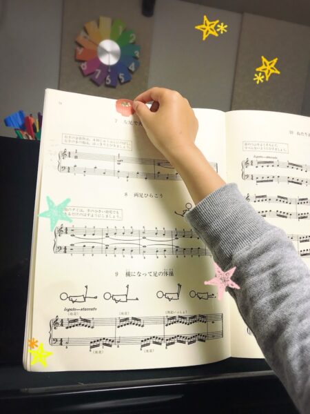 レッスン中、次に進むページに自分で可愛いクリップをつけたり、楽譜を準備したり。